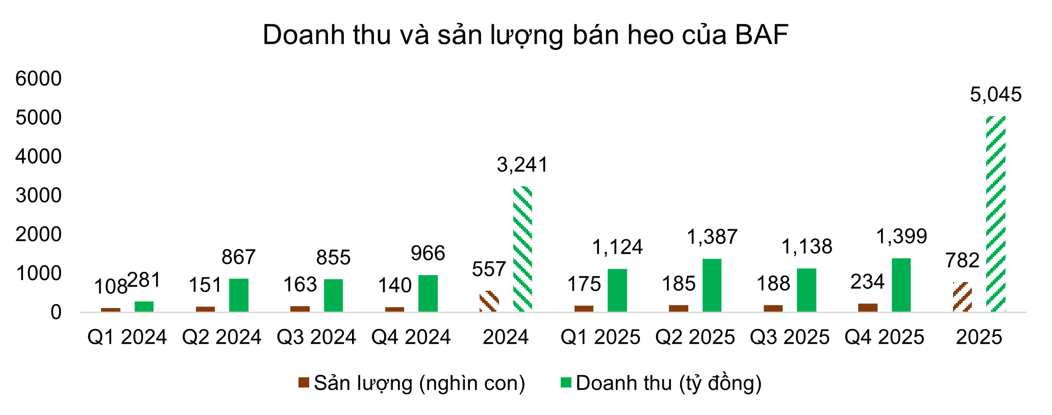 In February 2026, BAF will launch two farm clusters with a capacity of 5,000 sows, 60,000 fattening pigs, and 60,000 replacement pigs. Aiming to become Vietnam’s leading livestock company, BAF plans to open 16 new farms and a 300,000-ton/year feed mill in Binh Dinh in 2026. Additionally, a high-rise pig farming project (64,000 sows and 1.6 million fattening pigs) is set to begin construction in April 2026 and start operations in Q3/2027.