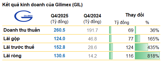 In Q4/2025, GIL recorded a record net profit of VND 130.6 billion, surging by 818% year-on-year, equivalent to over nine times the VND 14 billion profit in Q4/2024. This marks the highest quarterly profit in the company’s history.